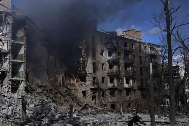 कोस्टियानटिनिव्का, यूक्रेन – 12 अक्टूबर: यूक्रेन के कोस्टियनटिनिव्का में 12 अक्टूबर, 2025 को रूसी गोलाबारी के बाद आंशिक रूप से क्षतिग्रस्त आवासीय इमारत से आग और धुआं उठता हुआ। (फोटो यान डोब्रोनोसोव/ग्लोबल इमेजेज यूक्रेन द्वारा गेटी इमेजेज के माध्यम से)