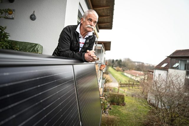 बाडेन-वुर्टेमबर्ग, जर्मनी: माइकल ब्रूनिंगर अपने अपार्टमेंट की बालकनी पर खड़े हैं, जहां सौर पैनल लगे हैं। फ़ोटो: फ़ेलिक्स कैस्टल/डीपीए (फ़ेलिक्स कैस्टल द्वारा फ़ोटो/गेटी इमेजेज़ के माध्यम से चित्र गठबंधन)