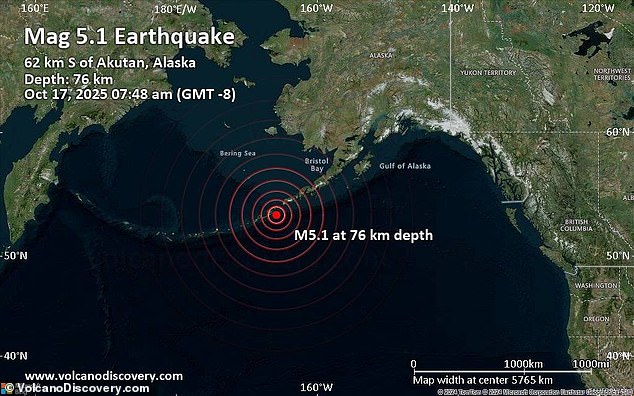 अमेरिकी भूवैज्ञानिक सर्वेक्षण (यूएसजीएस) ने सुबह 11:48 बजे ईटी पर भूकंप का पता लगाया, जो अकुतान के तट से लगभग 39 मील दूर है, जो लगभग 1,600 लोगों का घर है।