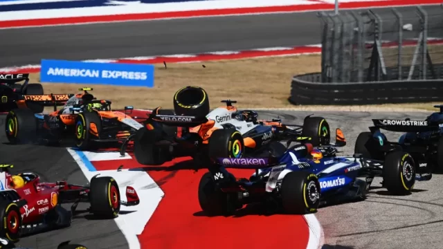 सर्किट ऑफ़ द अमेरिकाज़ की सामूहिक साँसें सुनी गईं, क्योंकि यूएस ग्रैंड प्रिक्स स्प्रिंट की पहली गोद के दौरान दो मैकलेरन ड्राइवरों को बारी-बारी से हाथापाई में इकट्ठा किया गया था।