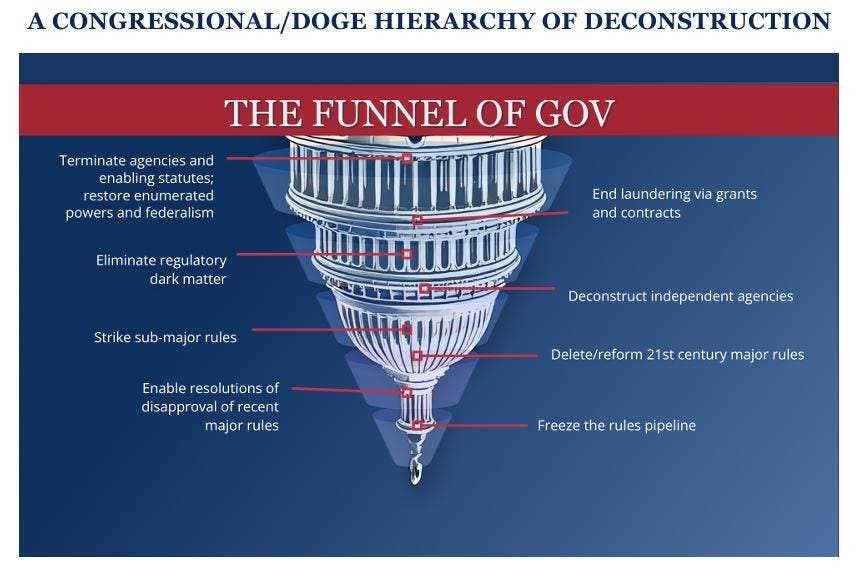 विनियामक सुधार के लिए एक स्थायी गठबंधन को फिर से मजबूत करने के लिए कार्यकारी शाखा द्वारा एकतरफा कटौती – या यहाँ तक कि व्यापक कांग्रेसी सुव्यवस्थितता से भी अधिक की आवश्यकता होगी। इसका अर्थ है निर्भरता के उस गहरे चक्र का सामना करना और उसे तोड़ना जो निचली सरकारों और निजी क्षेत्र को समान रूप से वाशिंगटन की जेब से बांधता है। यह केवल संघीय क़ानूनों, एजेंसियों और आयोगों और परामर्श वर्ग को ख़त्म करके ही होगा जो वाशिंगटन, डीसी को घेरने वाले आरामदायक उपनगरों से इसे संचालित करते हैं।