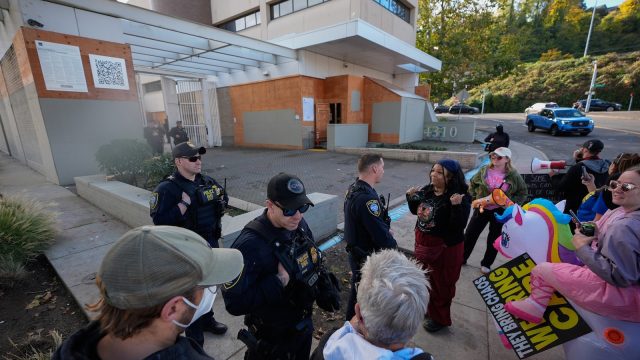 कानून प्रवर्तन अधिकारी 20 अक्टूबर, 2025 को पोर्टलैंड, ओरेगॉन में संयुक्त राज्य अमेरिका के आव्रजन और सीमा शुल्क प्रवर्तन (आईसीई) सुविधा के बाहर प्रदर्शनकारियों से बात करते हैं।
