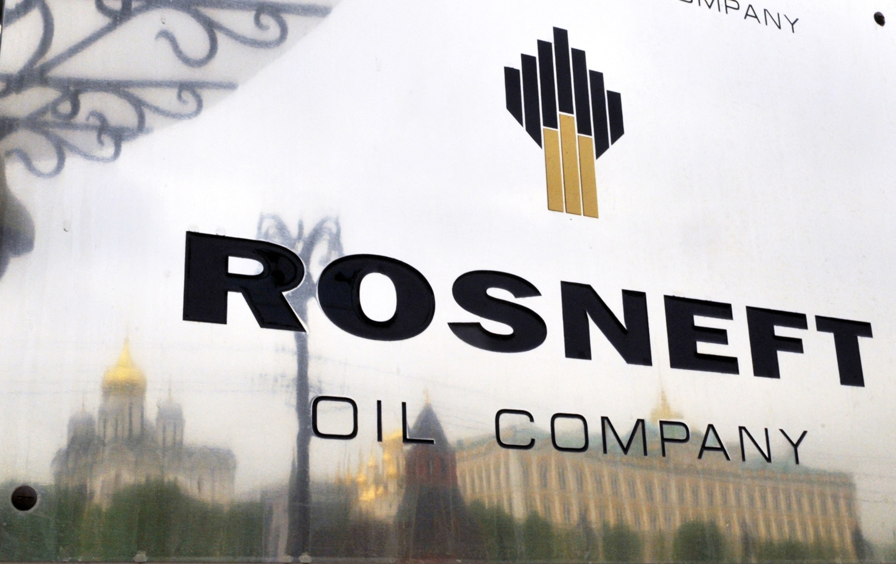 17 मई, 2011 की इस फाइल फोटो में, क्रेमलिन मॉस्को में मुख्यालय के प्रवेश द्वार पर राज्य-नियंत्रित रूसी तेल दिग्गज रोसनेफ्ट की पॉलिश कंपनी प्लेट में प्रतिबिंबित होता है।