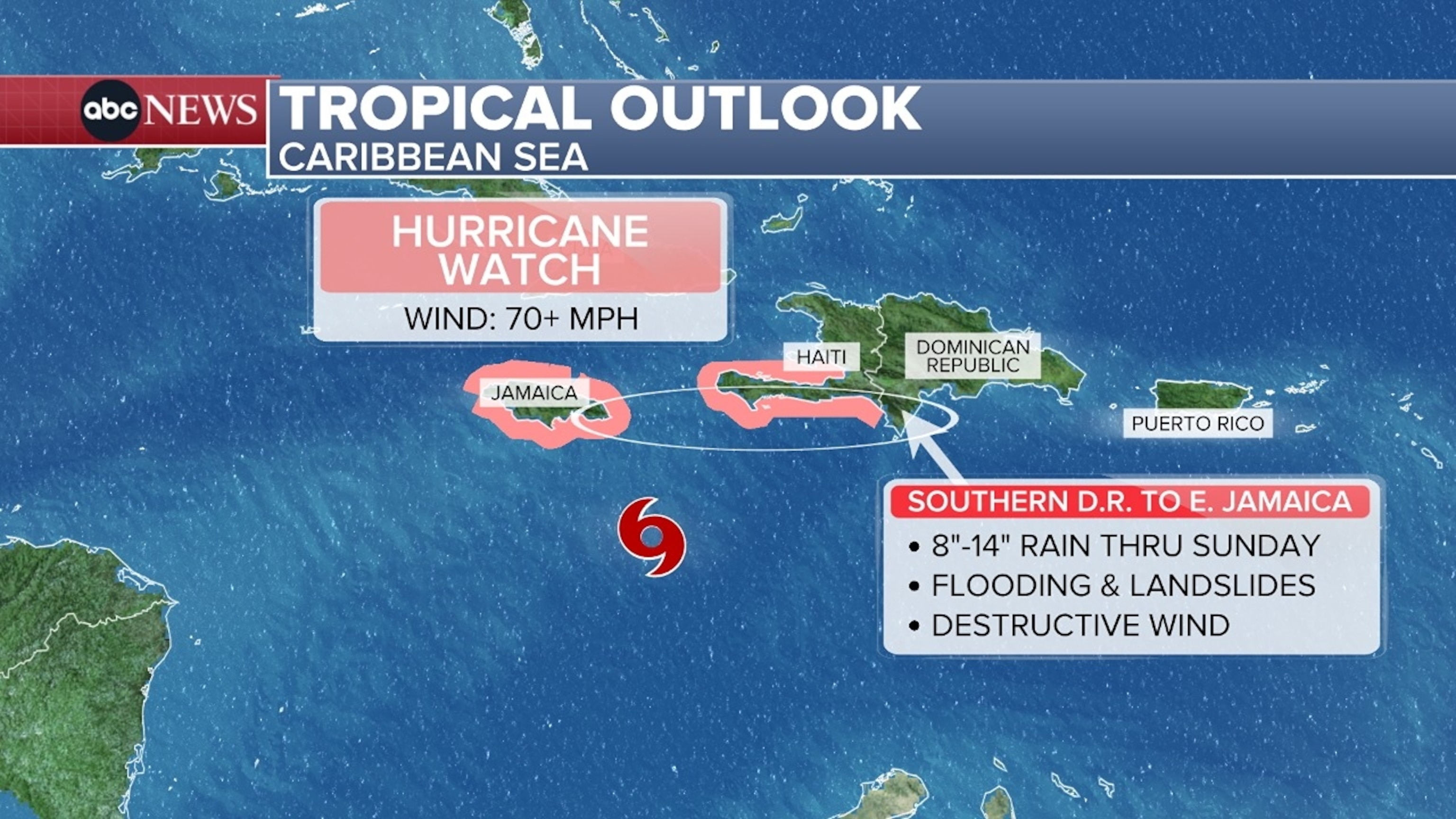 दक्षिणी डोमिनिकन गणराज्य, दक्षिणी हैती और पूर्वी जमैका में शुक्रवार से रविवार की रात तक आठ से 14 इंच बारिश हो सकती है, जिससे जीवन के लिए खतरा पैदा हो सकता है।