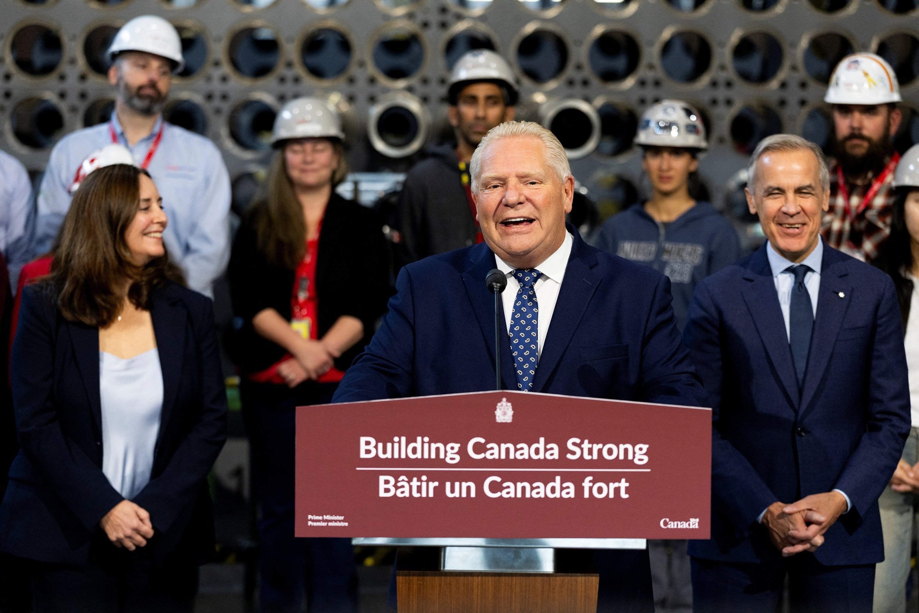 कनाडा के प्रधान मंत्री मार्क कार्नी 23 अक्टूबर, 2025 को कोर्टिस, ओंटारियो, कनाडा में डार्लिंगटन एनर्जी कॉम्प्लेक्स में एक मॉक रिएक्टर के सामने एक प्रेस कॉन्फ्रेंस के दौरान ओंटारियो प्रीमियर डौग फोर्ड के भाषण को सुनते हैं।