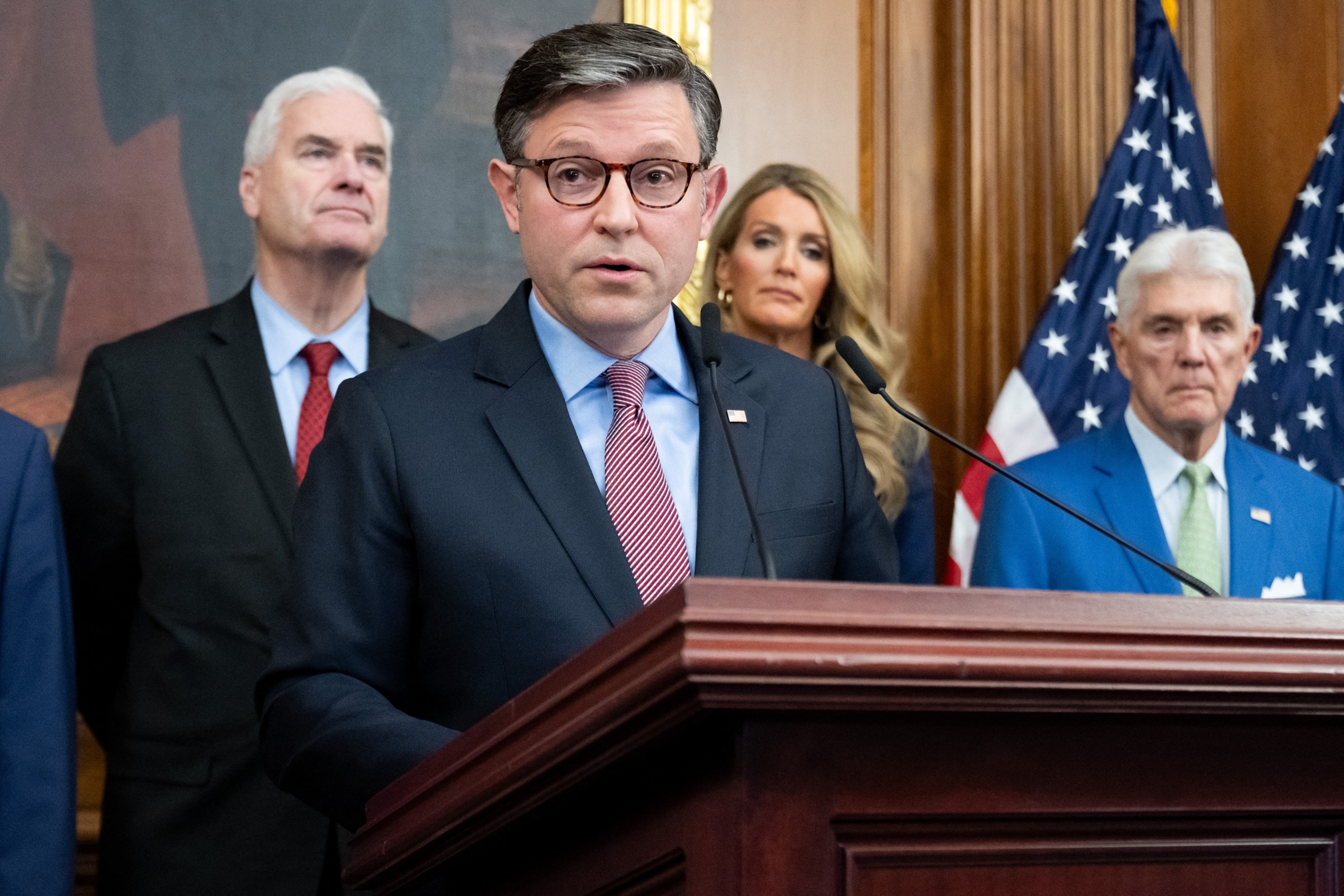 सदन के अध्यक्ष माइक जॉनसन 27 अक्टूबर, 2025 को वाशिंगटन में कैपिटल में एक संवाददाता सम्मेलन के दौरान 27वें दिन सरकारी शटडाउन के बारे में बोलते हैं।