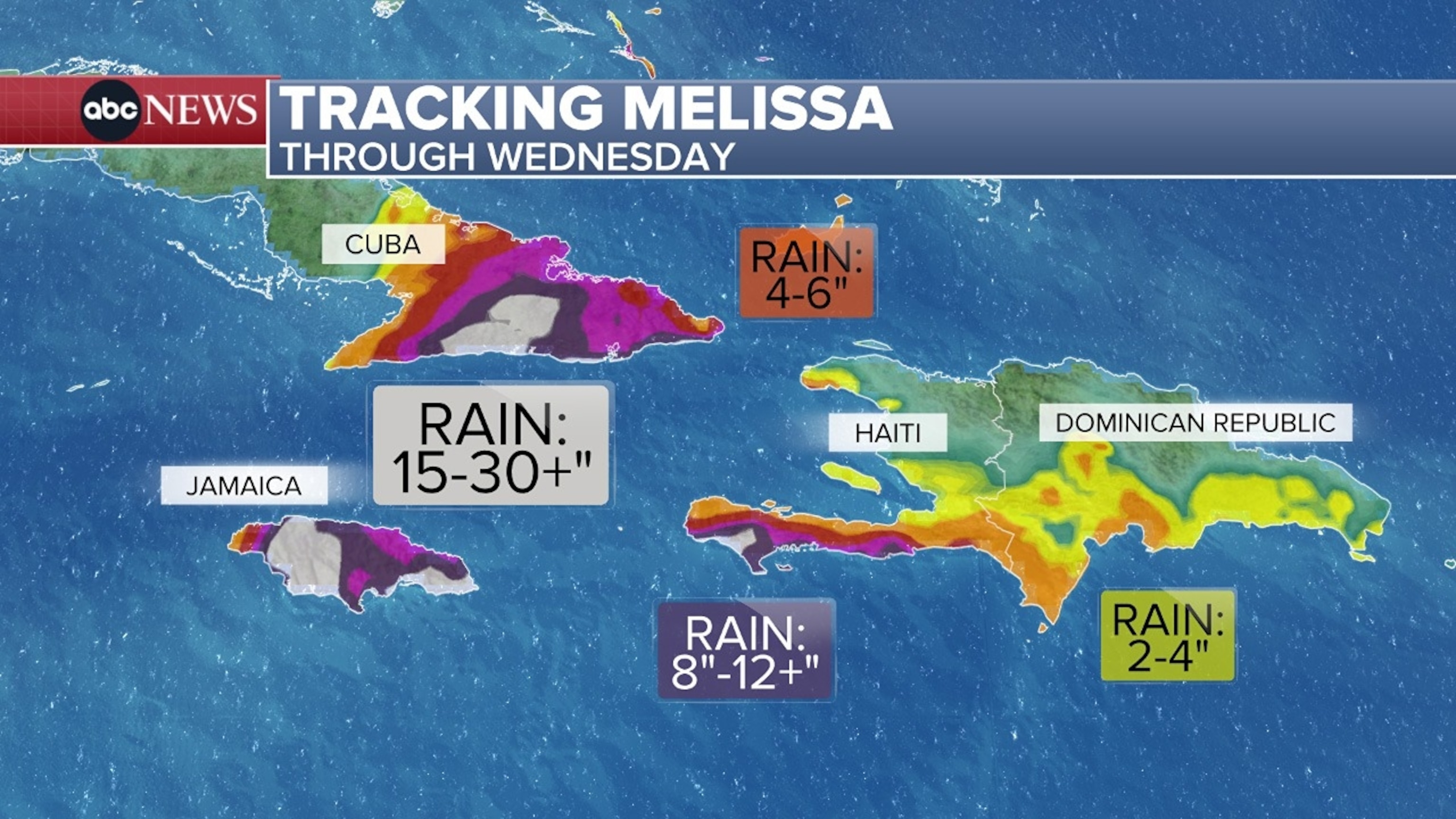बारिश और तूफ़ान का उछाल हवा से भी ज्यादा खतरनाक होगा कुछ के लिए. मेलिसा बहुत धीमी गति से आगे बढ़ रही है, इसलिए यह जमैका में भारी बारिश लाएगी, जिसका कुल अनुमान 15 से 30 इंच और यहां तक कि स्थानीय क्षेत्रों में 40 इंच तक पहुंचने का अनुमान है। इससे सोमवार और मंगलवार को विनाशकारी और जीवन-घातक बाढ़ आ जाएगी।