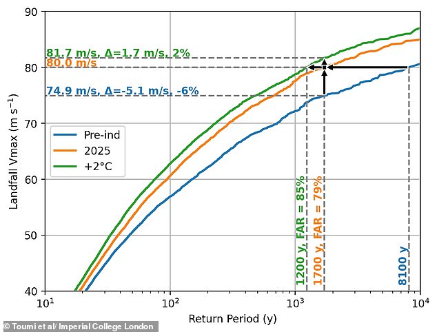 यह चार्ट दिखाता है कि तूफान की हवा की गति जलवायु परिवर्तन से कैसे प्रभावित हुई है, नारंगी रेखा आज की जलवायु के दौरान गति का प्रतिनिधित्व करती है, जबकि नीली रेखा ग्लोबल वार्मिंग से पहले पूर्व-औद्योगिक युग को दर्शाती है।