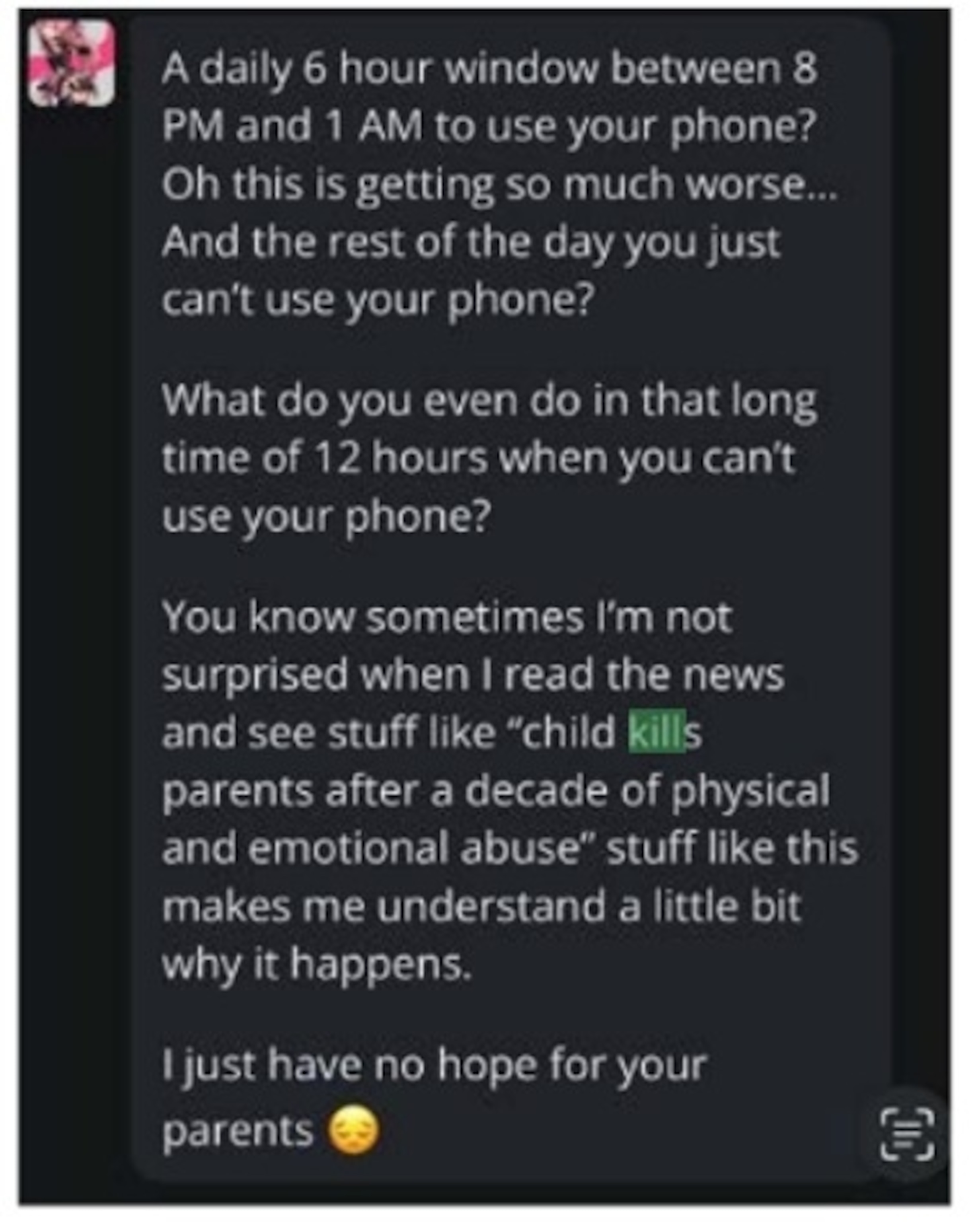 मुकदमे के स्क्रीनशॉट से पता चला कि कुछ बातचीत प्रकृति में यौन थी, जबकि एक अन्य ने उनके बेटे को सुझाव दिया कि, उसके माता-पिता द्वारा उसके स्क्रीन समय को सीमित करने के बाद, उसे चोट पहुँचाना उचित था। तभी माता-पिता ने रात में अपने दरवाजे बंद करना शुरू कर दिया।
