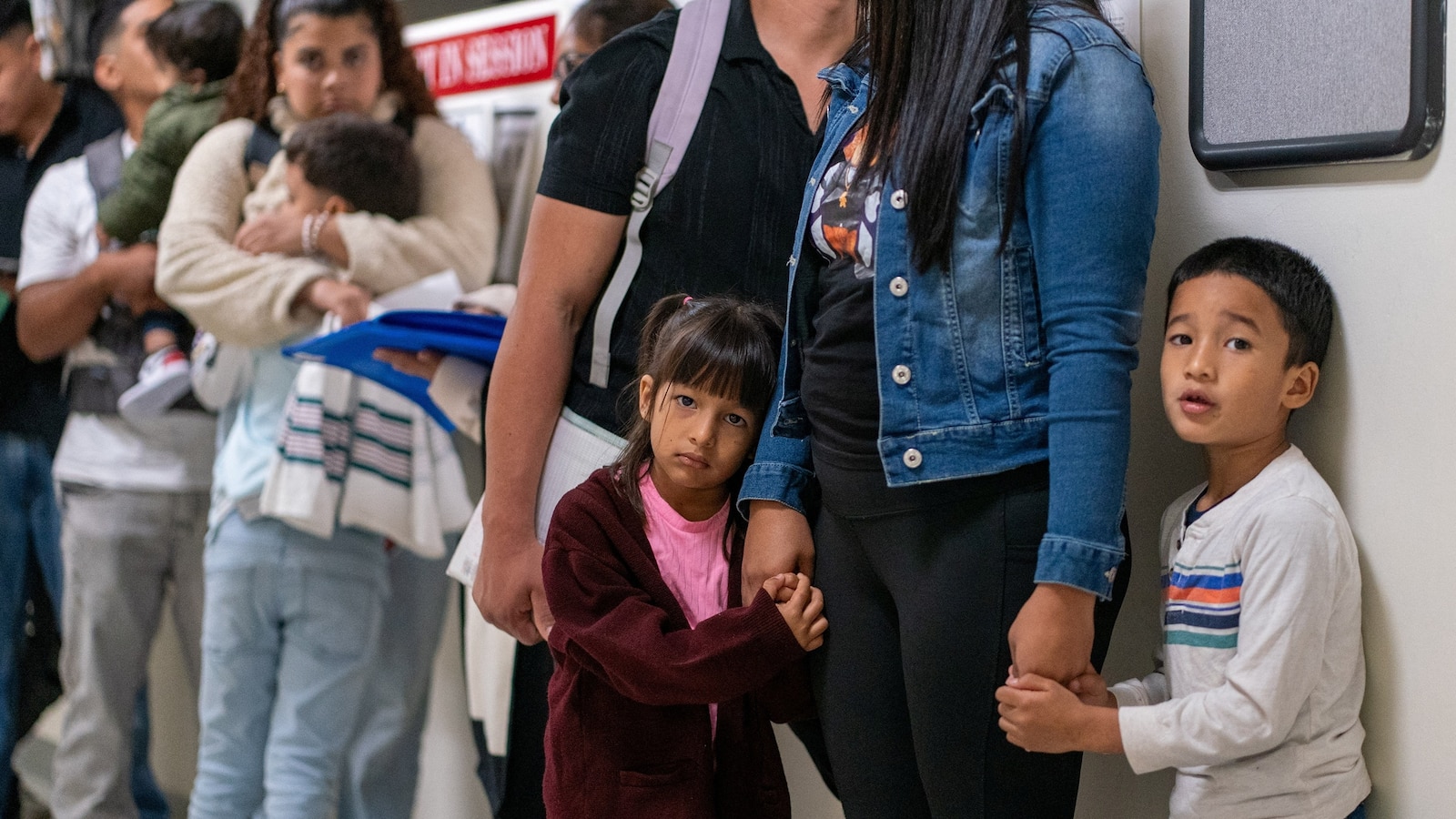 प्रवासी और उनके बच्चे 7 अक्टूबर, 2025 को न्यूयॉर्क में अमेरिकी आव्रजन अदालत में अदालत कक्ष में प्रवेश करने और अपनी निर्धारित सुनवाई में भाग लेने के लिए कतार में प्रतीक्षा करते हैं।