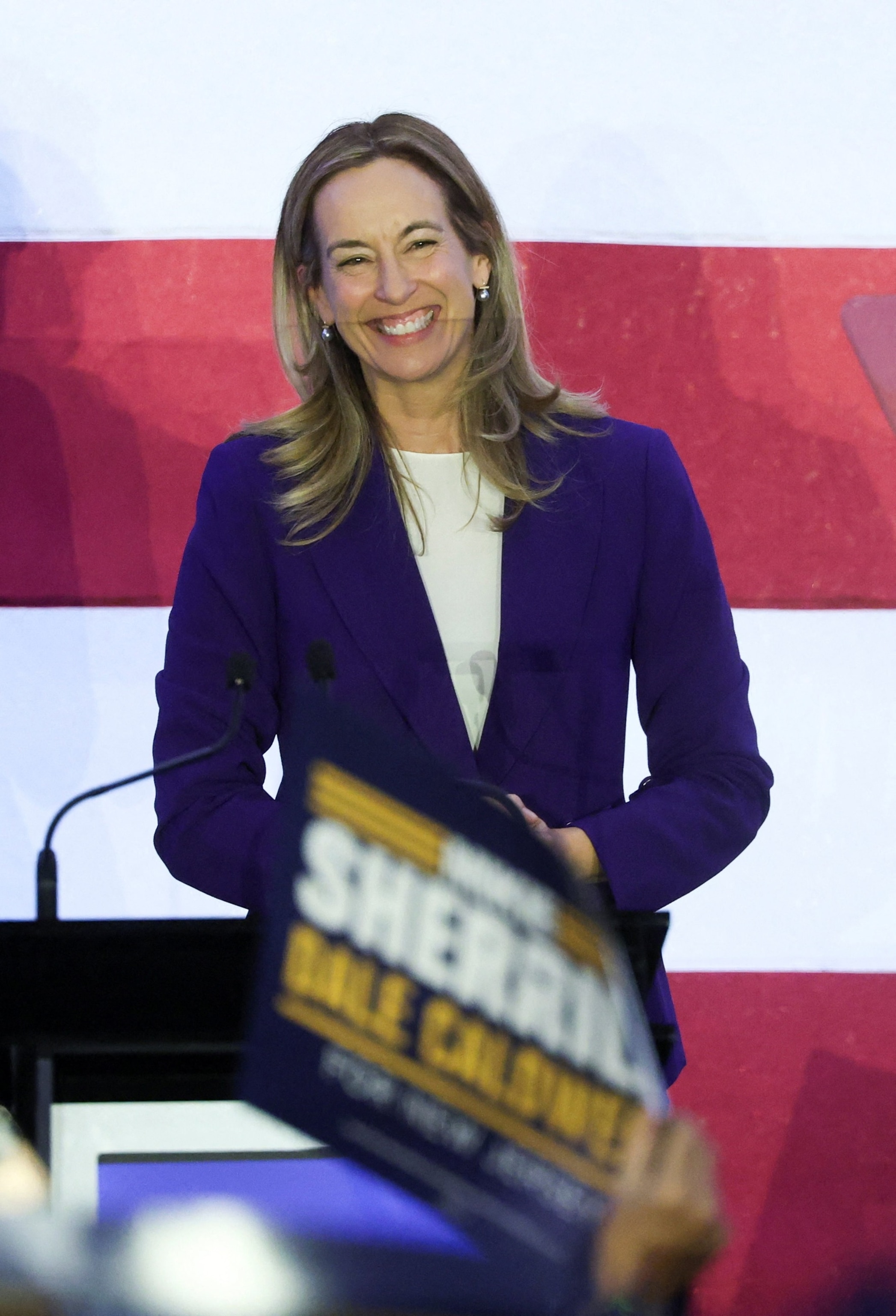 प्रतिनिधि मिकी शेरिल, न्यू जर्सी के लिए डेमोक्रेटिक गवर्नर उम्मीदवार, 4 नवंबर, 2025 को ईस्ट ब्रंसविक, न्यू जर्सी में अपनी चुनावी रात की रैली में मंच पर प्रतिक्रिया व्यक्त करते हुए।