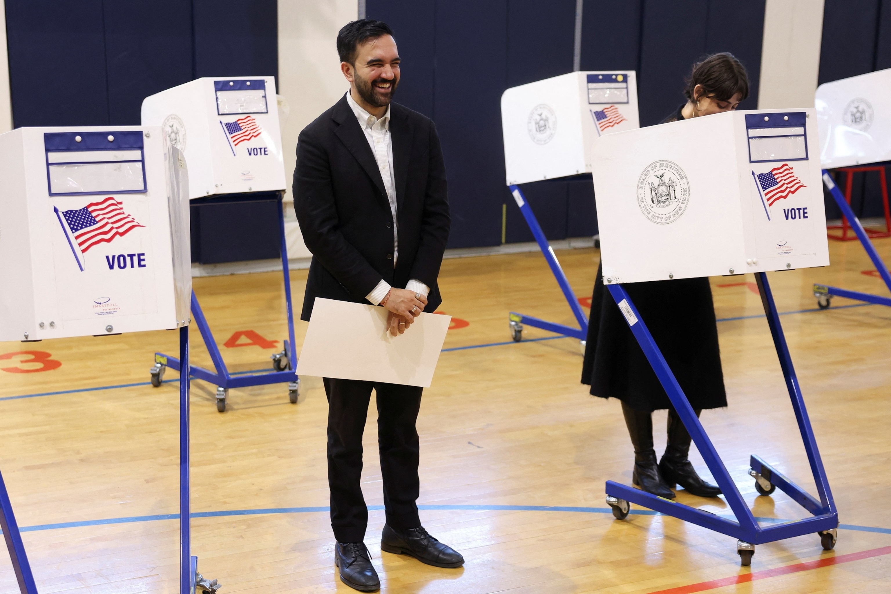 न्यूयॉर्क शहर के मेयर के लिए डेमोक्रेटिक उम्मीदवार, ज़ोहरान ममदानी, 4 नवंबर, 2025 को न्यूयॉर्क शहर के एस्टोरिया, क्वींस बोरो में एक मतदान स्थल पर न्यूयॉर्क शहर के मेयर चुनाव में अपनी पत्नी रामा दुवाजी के वोट देने का इंतज़ार कर रहे हैं।