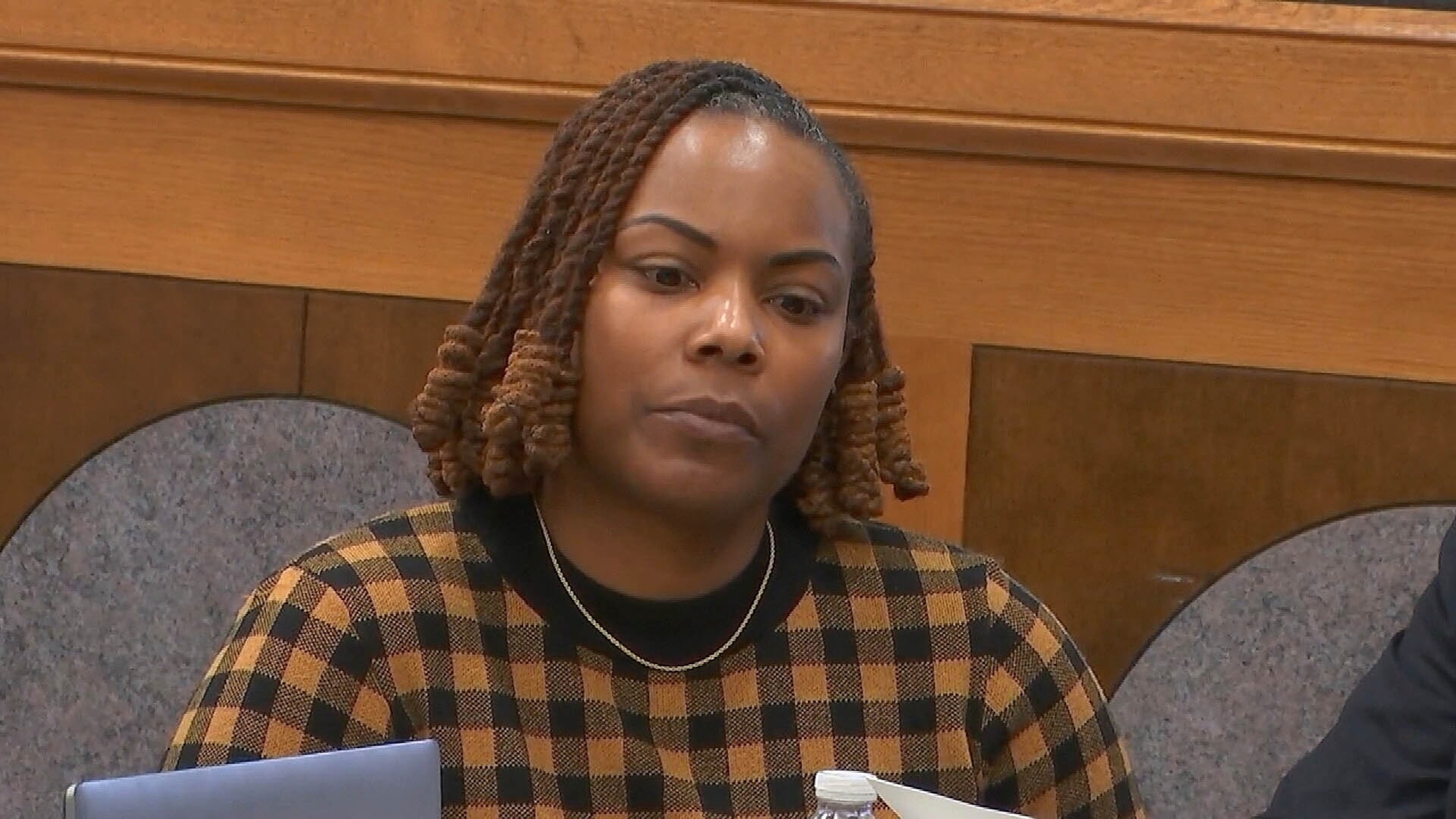 रिचनेक एलीमेंट्री स्कूल की पूर्व सहायक प्रिंसिपल एबोनी पार्कर, न्यूपोर्ट न्यूज़, वीए में 30 अक्टूबर, 2025 को एबी ज़्वर्नर के मुकदमे के दौरान अदालत कक्ष में।