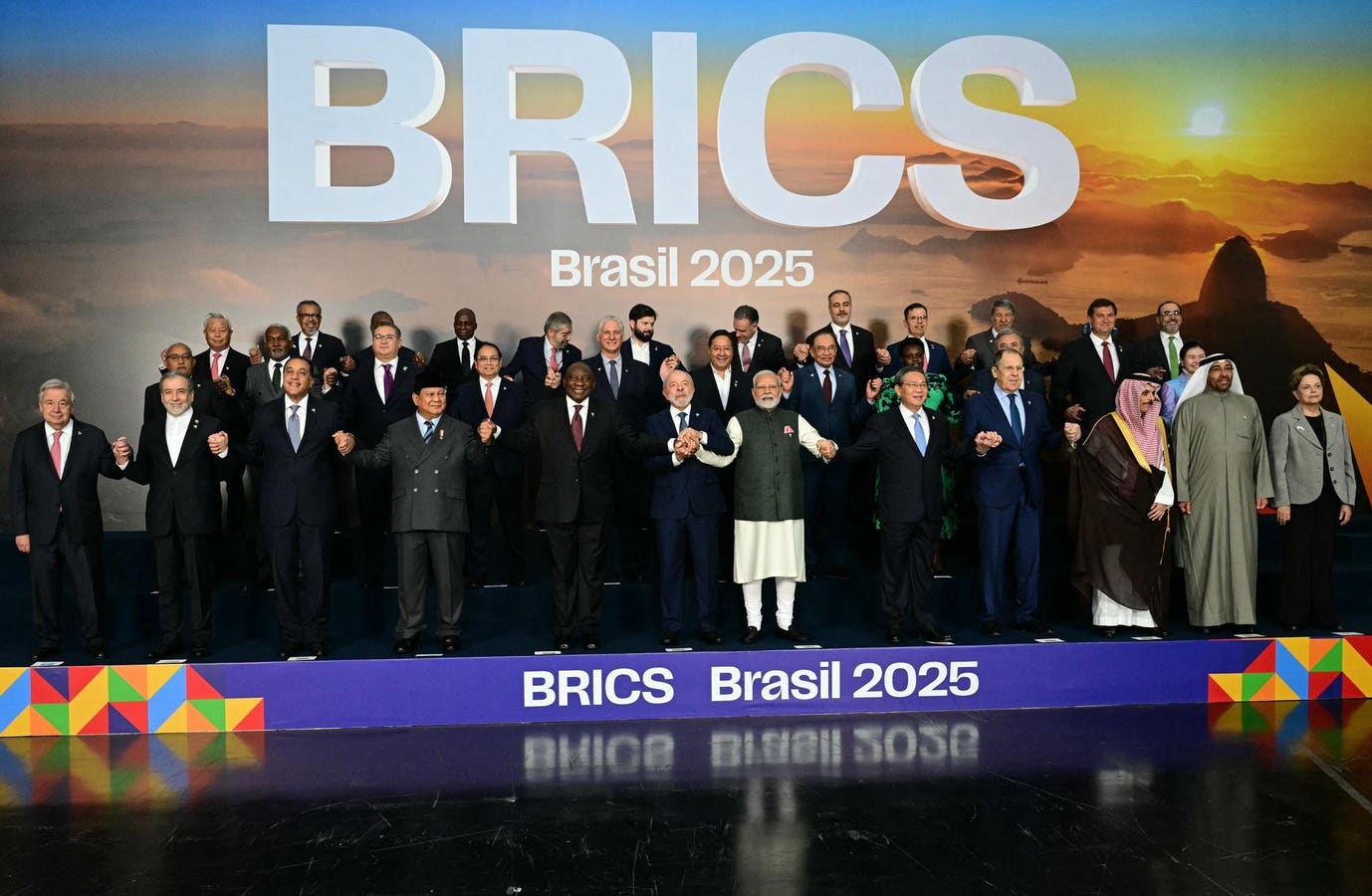 7 जुलाई, 2025 को ब्राजील के रियो डी जनेरियो में ब्रिक्स शिखर सम्मेलन के दौरान सदस्य, भागीदार और बाहरी जुड़ाव वाले देशों के राष्ट्राध्यक्षों और सरकार के प्रमुखों ने एक पारिवारिक फोटो के लिए पोज़ दिया। रविवार को एक शिखर सम्मेलन में ब्रिक्स नेताओं ने अमेरिकी राष्ट्रपति डोनाल्ड ट्रम्प के “अंधाधुंध” आयात शुल्क और ईरान पर हाल ही में इजरायल-अमेरिका के हमलों पर निशाना साधा। (फोटो पाब्लो पोर्सियुनकुला/एएफपी द्वारा) (फोटो पाब्लो पोर्सियुनकुला/एएफपी द्वारा गेटी इमेजेज के माध्यम से)