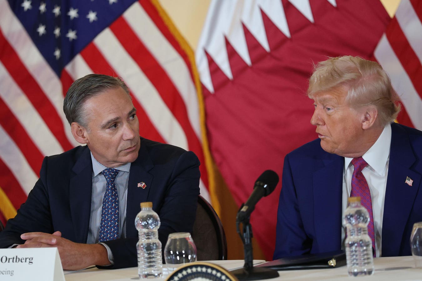 दोहा, कतर – 15 मई: अमेरिकी राष्ट्रपति डोनाल्ड जे. ट्रम्प (आर) 15 मई, 2025 को दोहा, कतर में बोइंग के सीईओ केली ऑर्टबर्ग से बात करते हैं। (फोटो विन मैकनेमी/गेटी इमेजेज द्वारा)