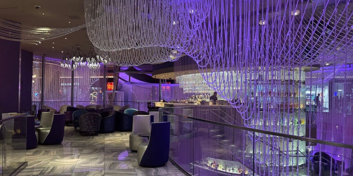 कॉस्मो में चंदेलियर बार का प्रवेश द्वार, कांच की बालकनी के किनारे के बगल में लटके हुए झूमर के तारों के साथ